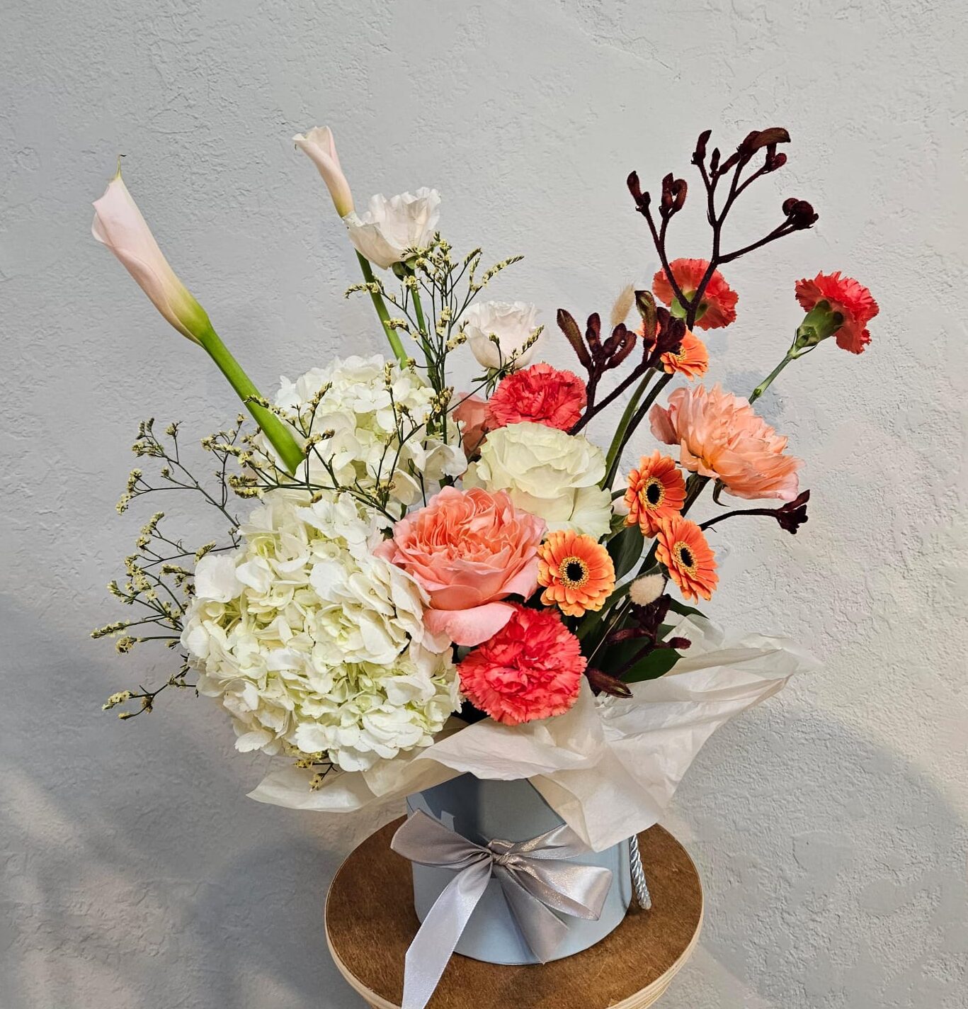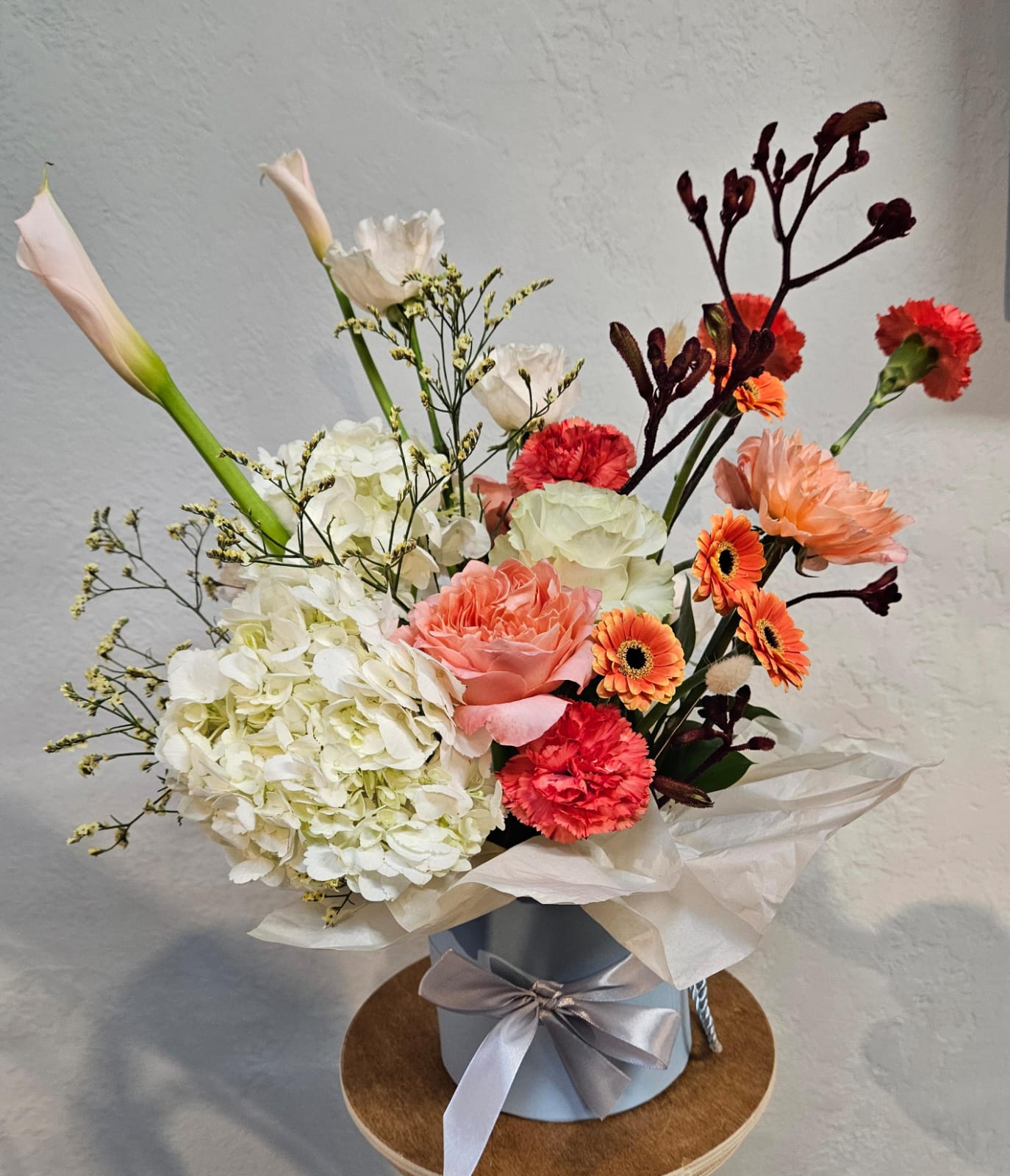 Složení: hortenzie, gerbery, růže, anigozanthos, karafiáty, kaly a zeleň.