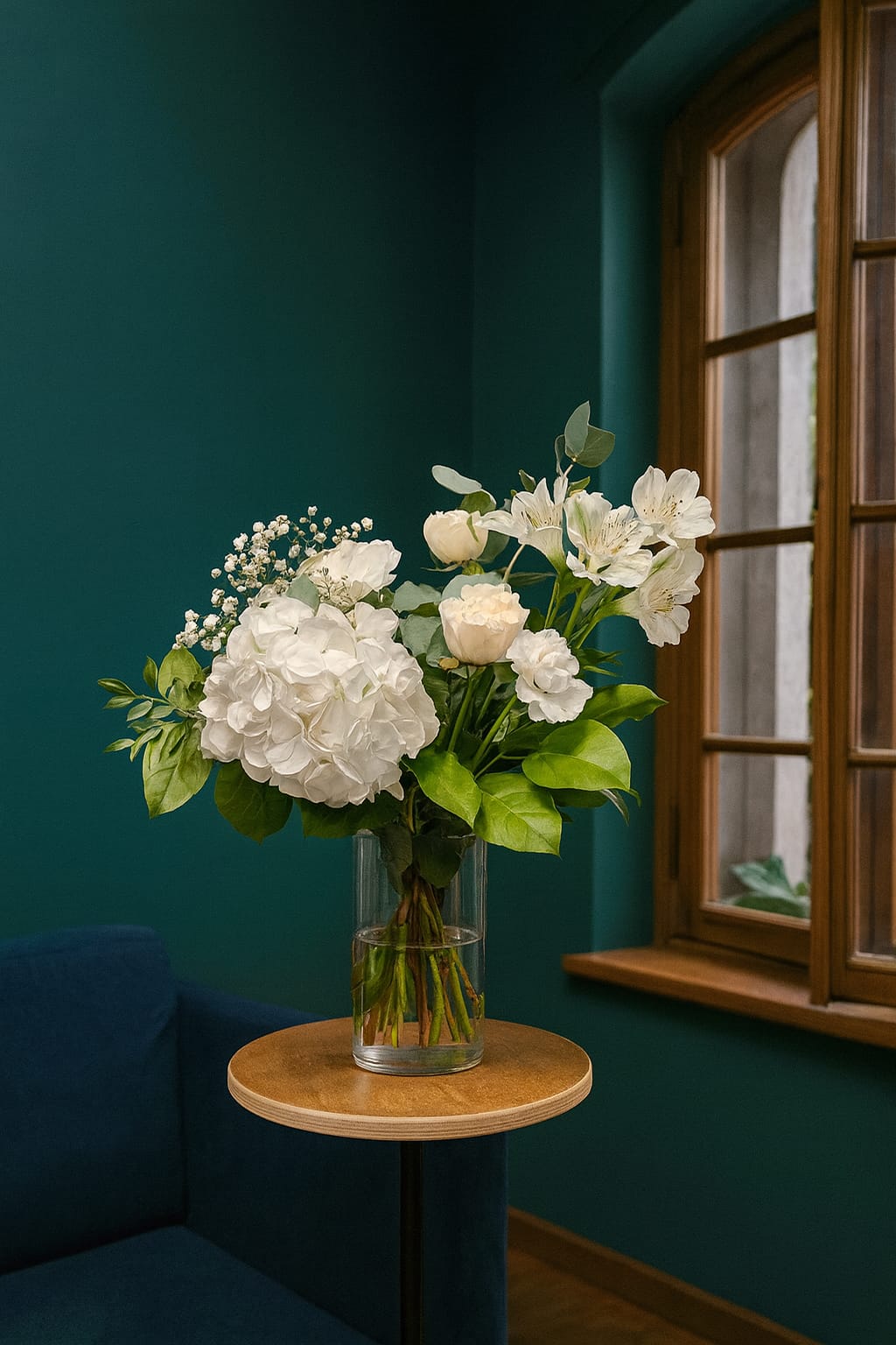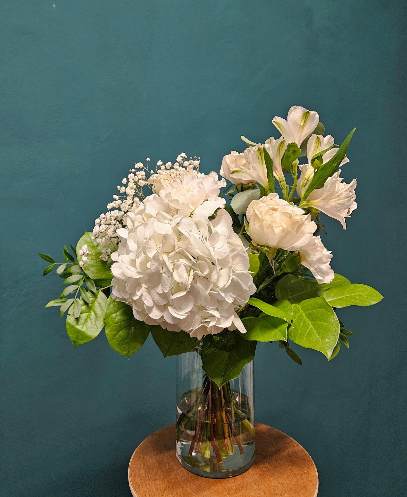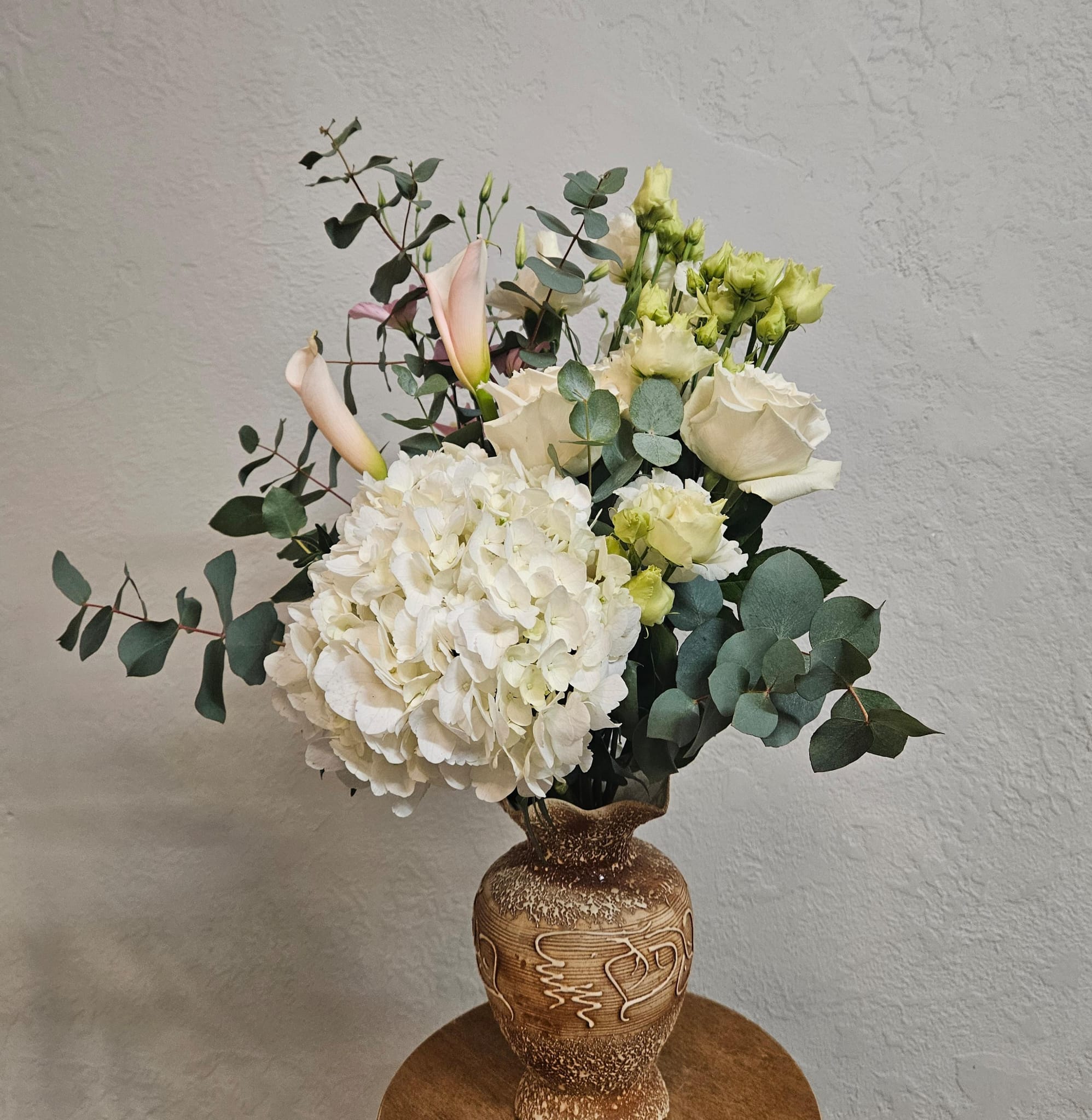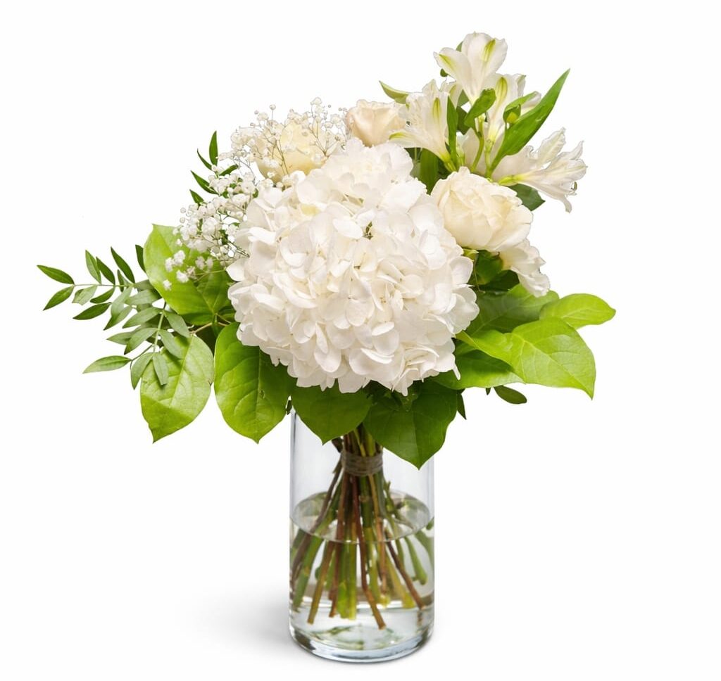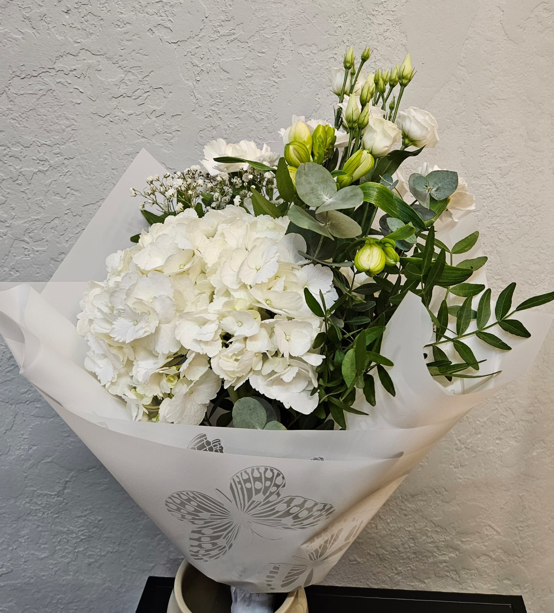 Kytice plná jemnosti — bílá hortenzie, růže a lehké květy eustomy a alstroemerie tvoří elegantní, čistý celek doplněný vůní eukalyptu.