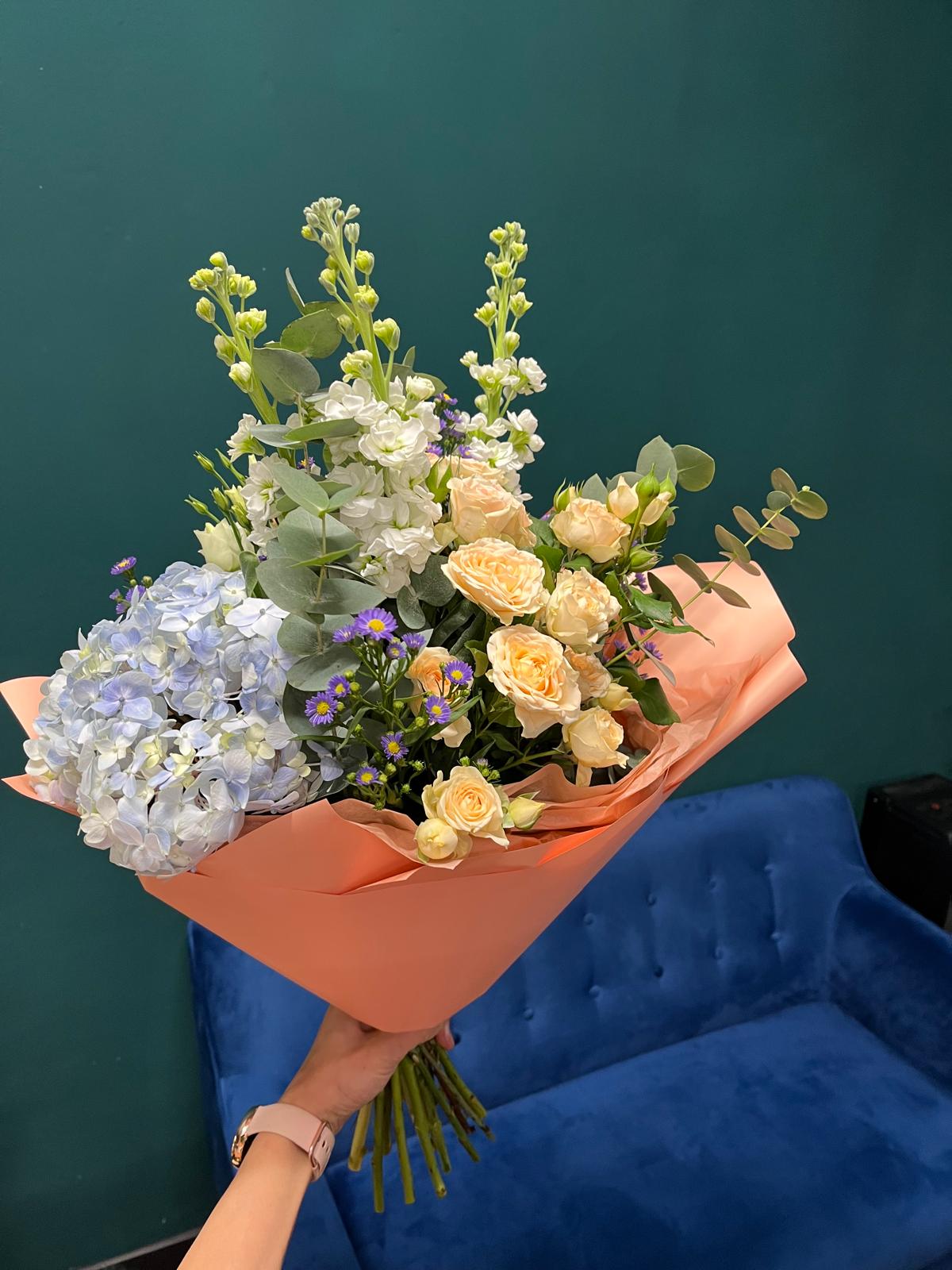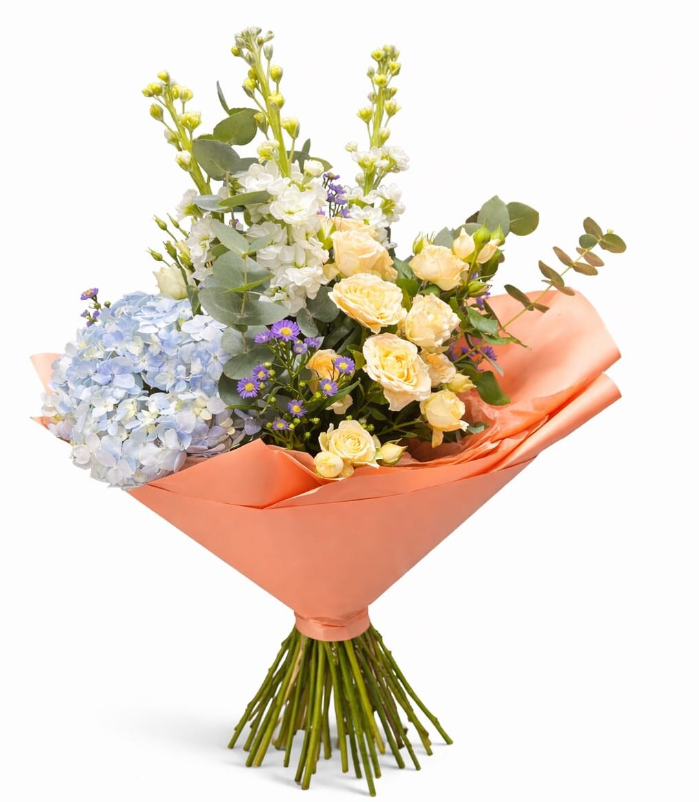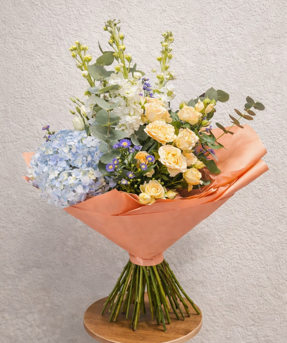 Vzdušná kytice v meruňkových a modrých tónech přináší svěžest, jemnost a radost z každého detailu.