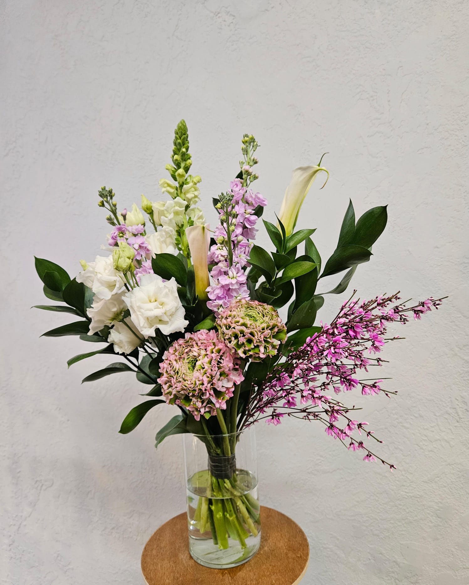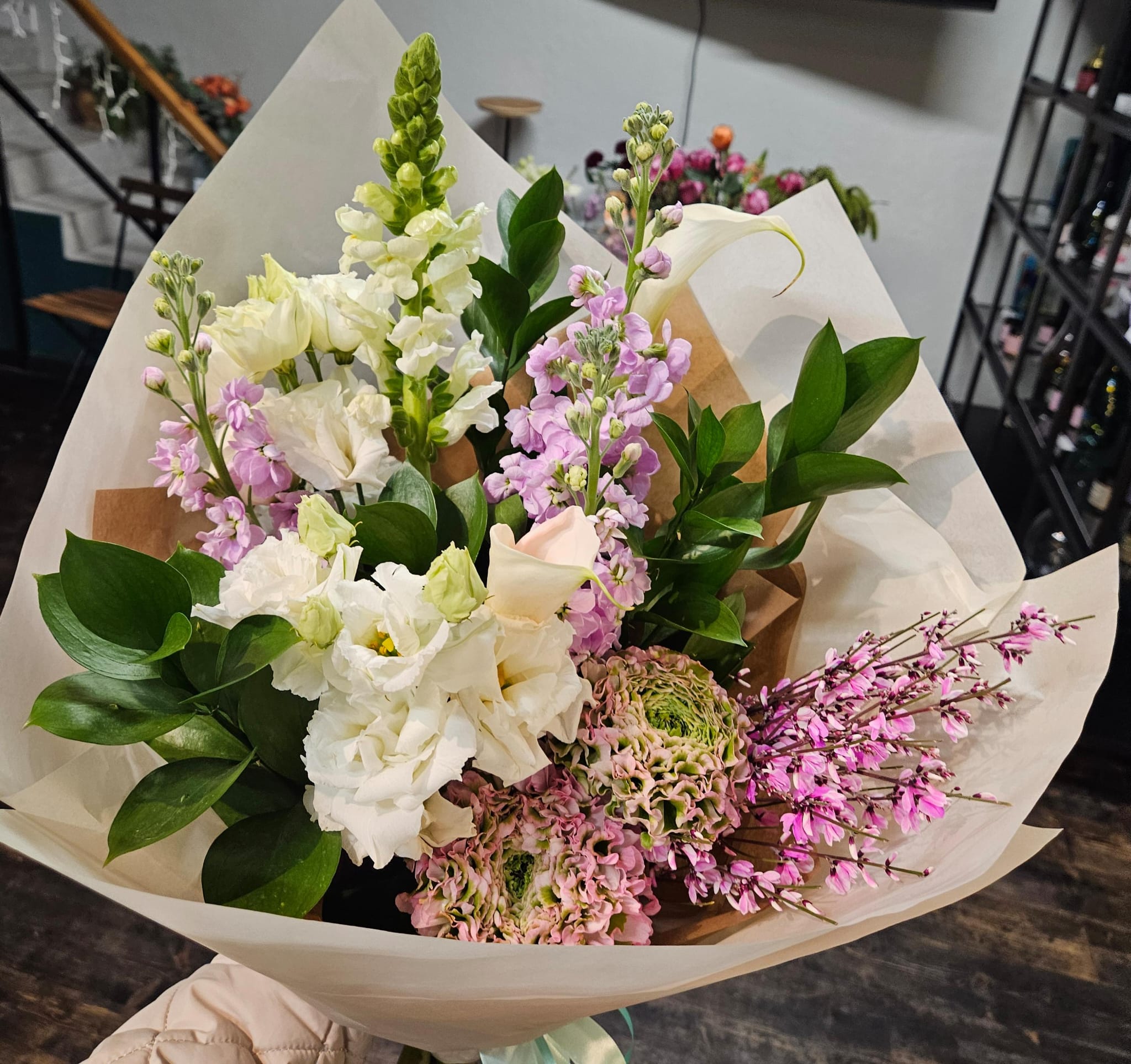 Jemná kytice v pastelových tónech připomínající tiché a svěží jarní ráno.