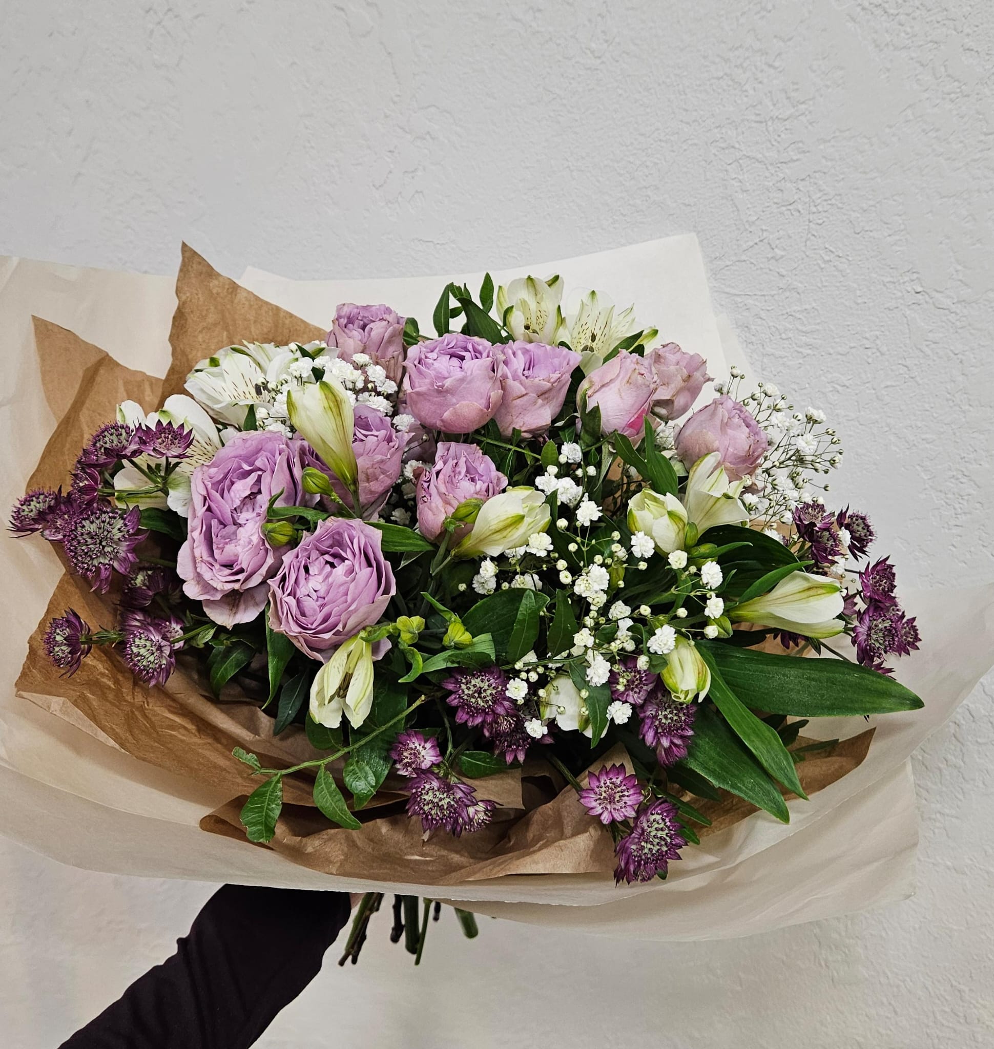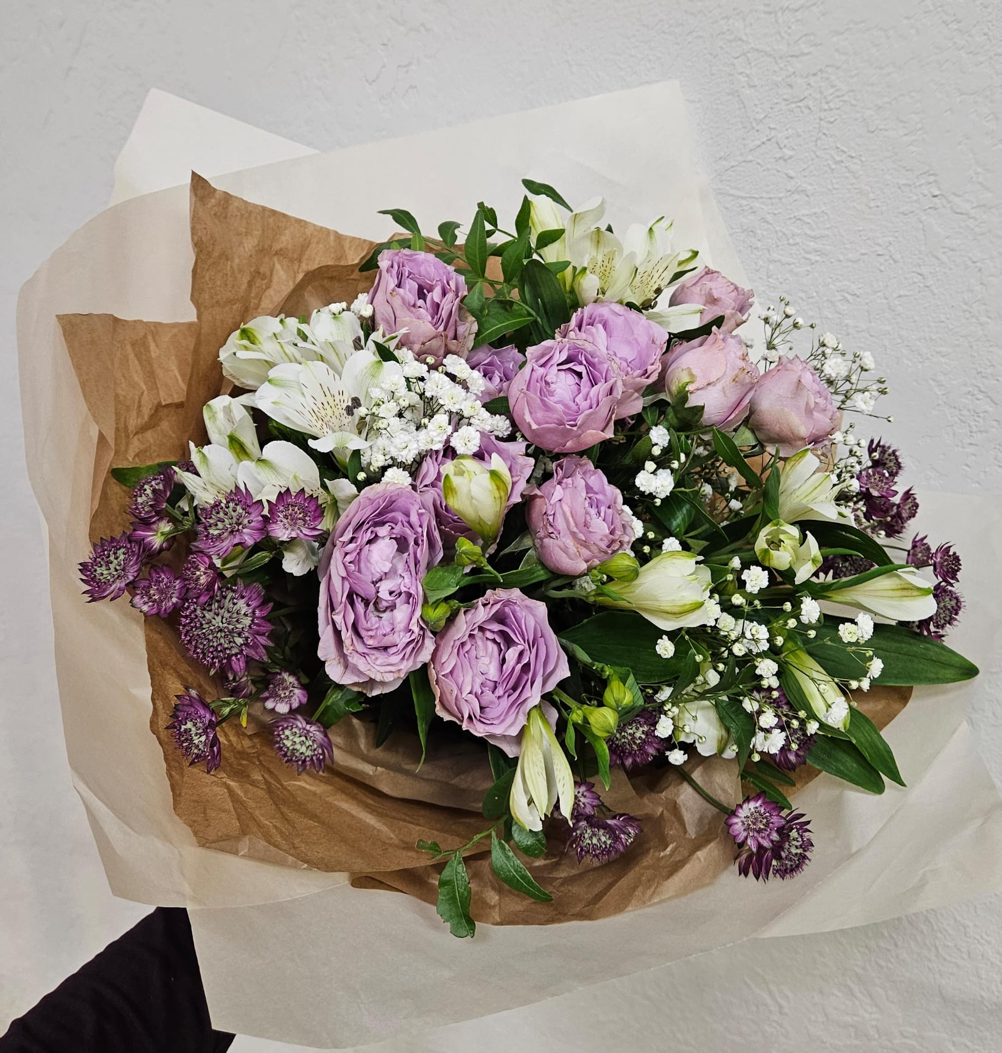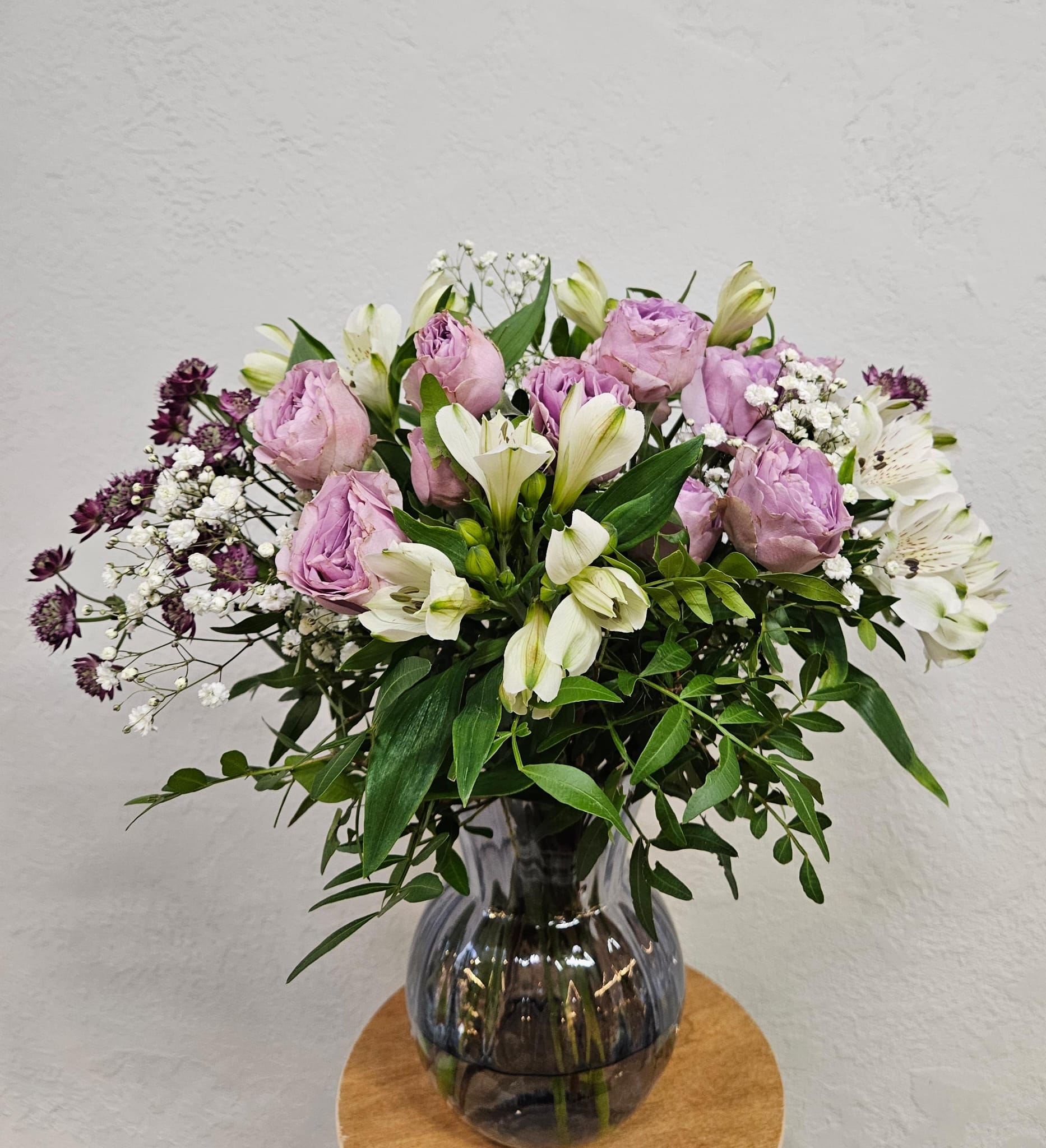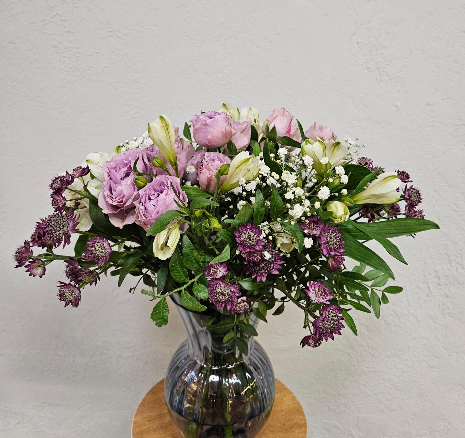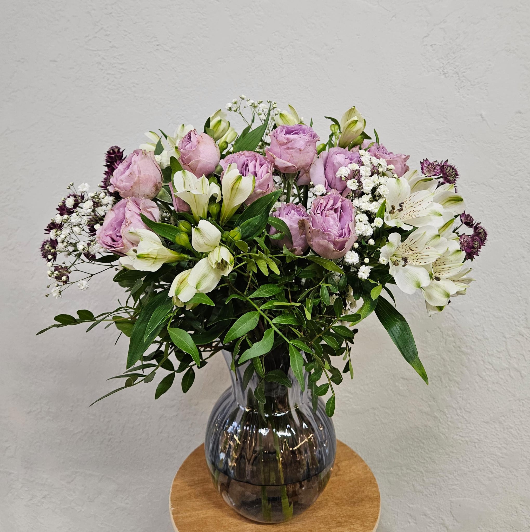 Růže, alstroemerie, jarmanka, nevěstin závoj, zeleň.