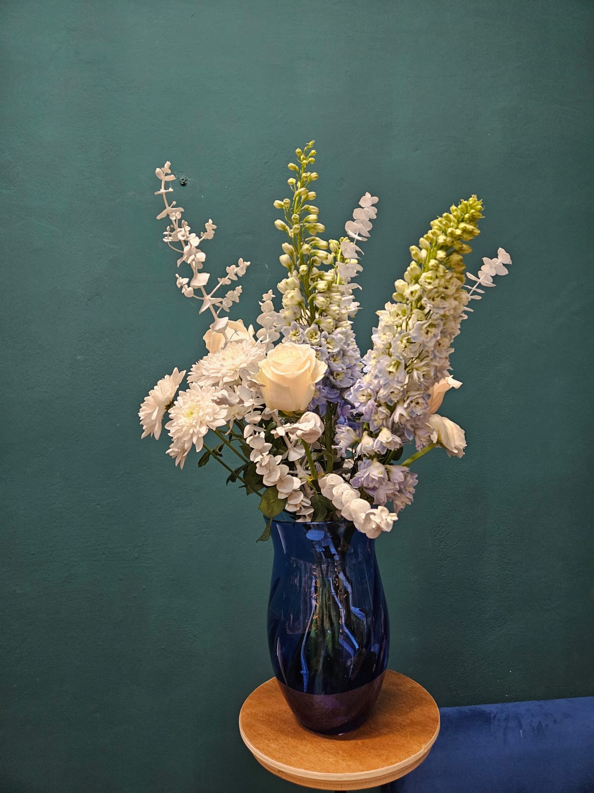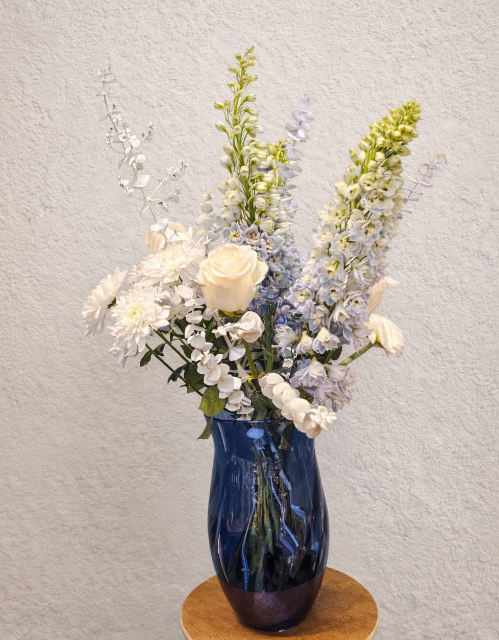 Jemná kytice v tónech bílé a světle modré působí klidně a nadčasově.