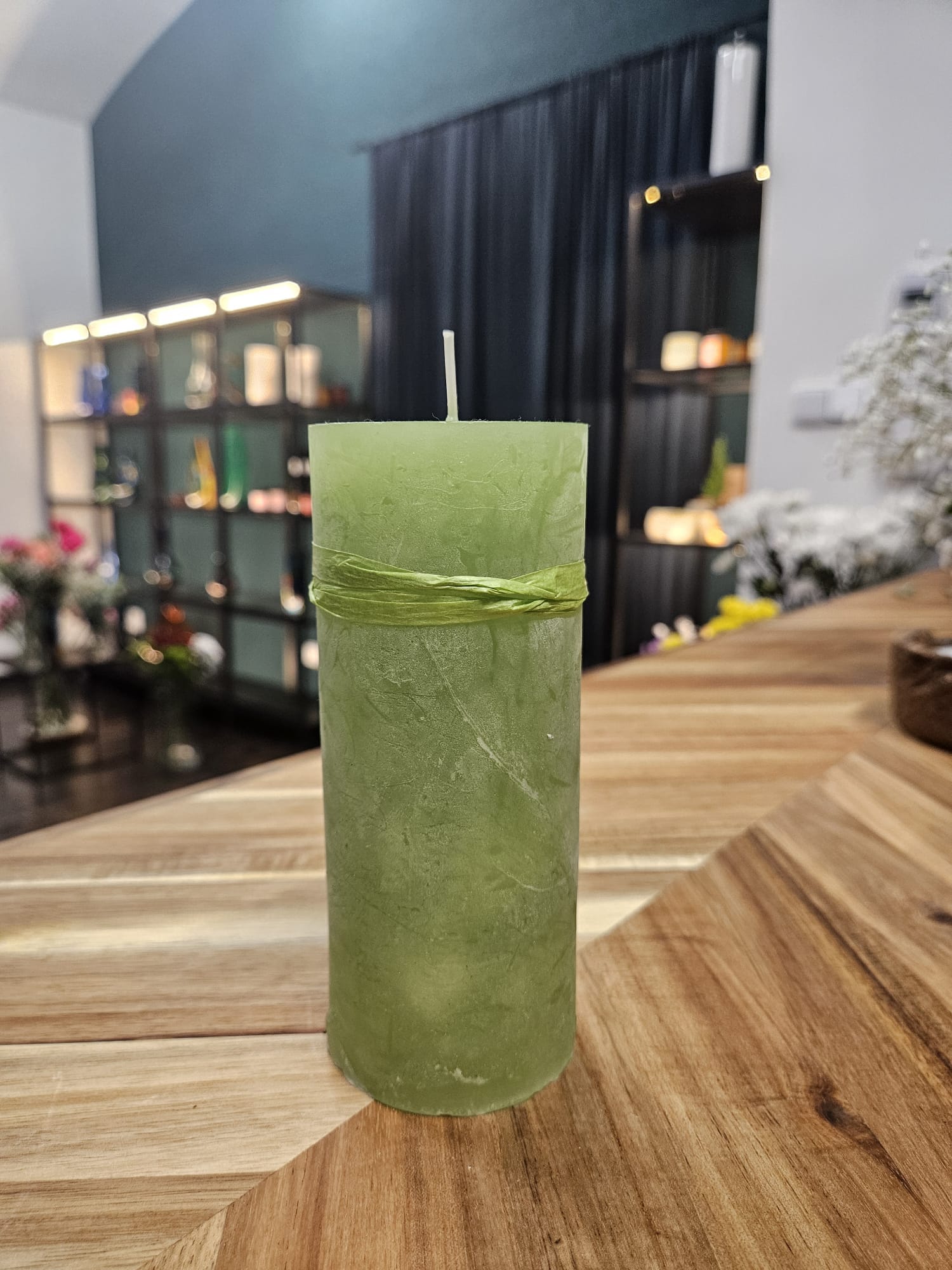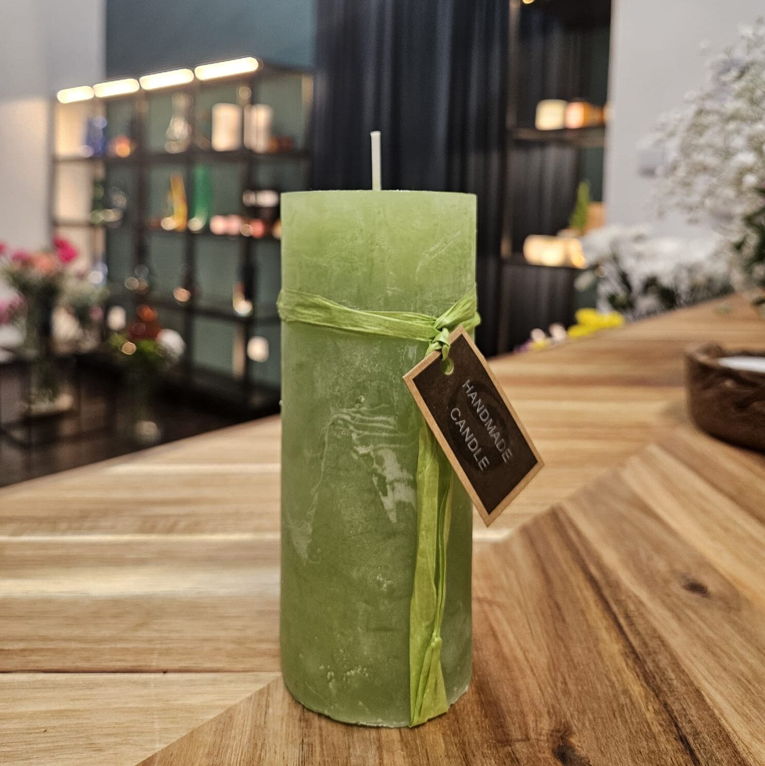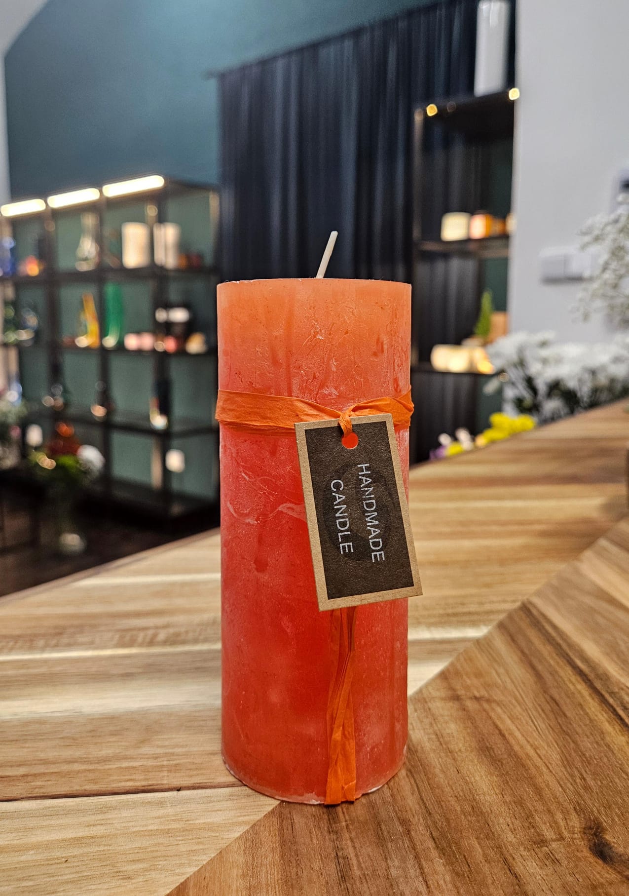 Ručně vyráběná svíčka ve dvou barevných variantách: zelená a oranžová.