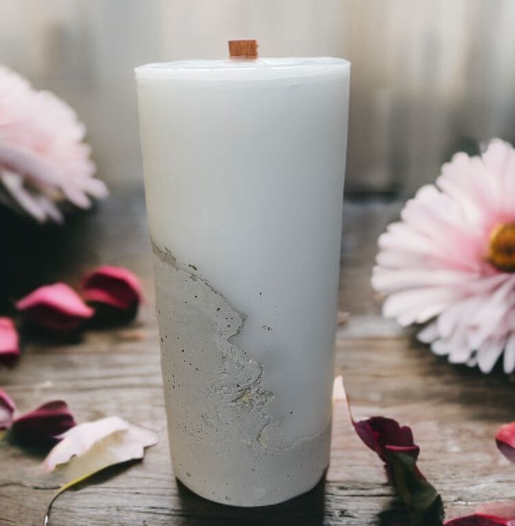 Dekorativní svíčka z parafínu a betonu s dřevěným knotem.