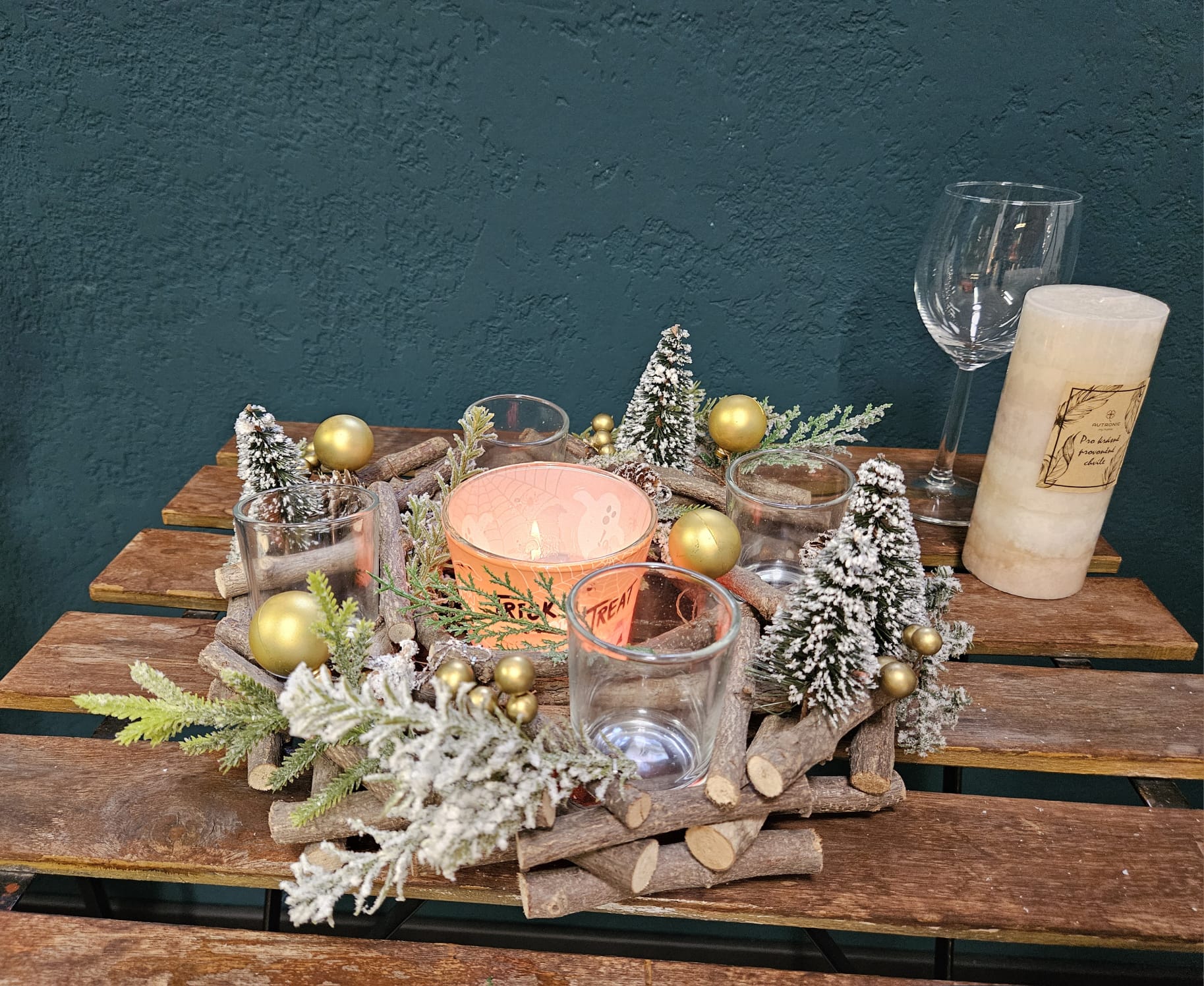 Složení: přírodní větve a dřevo, umělé jehličnaté větvičky, skleněné svícínky.