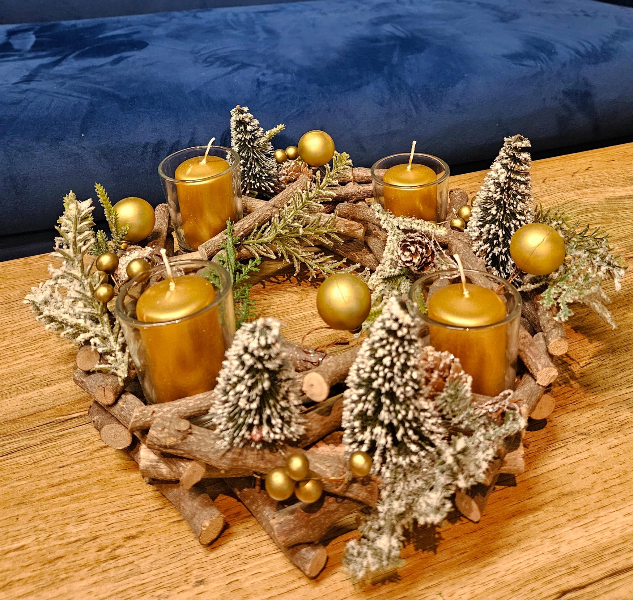 Stolní vánoční věnec vyrobený z přírodních dřevěných větví, doplněný umělými sněženými jehličnatými větvičkami, šiškami a zlatými dekoracemi.
