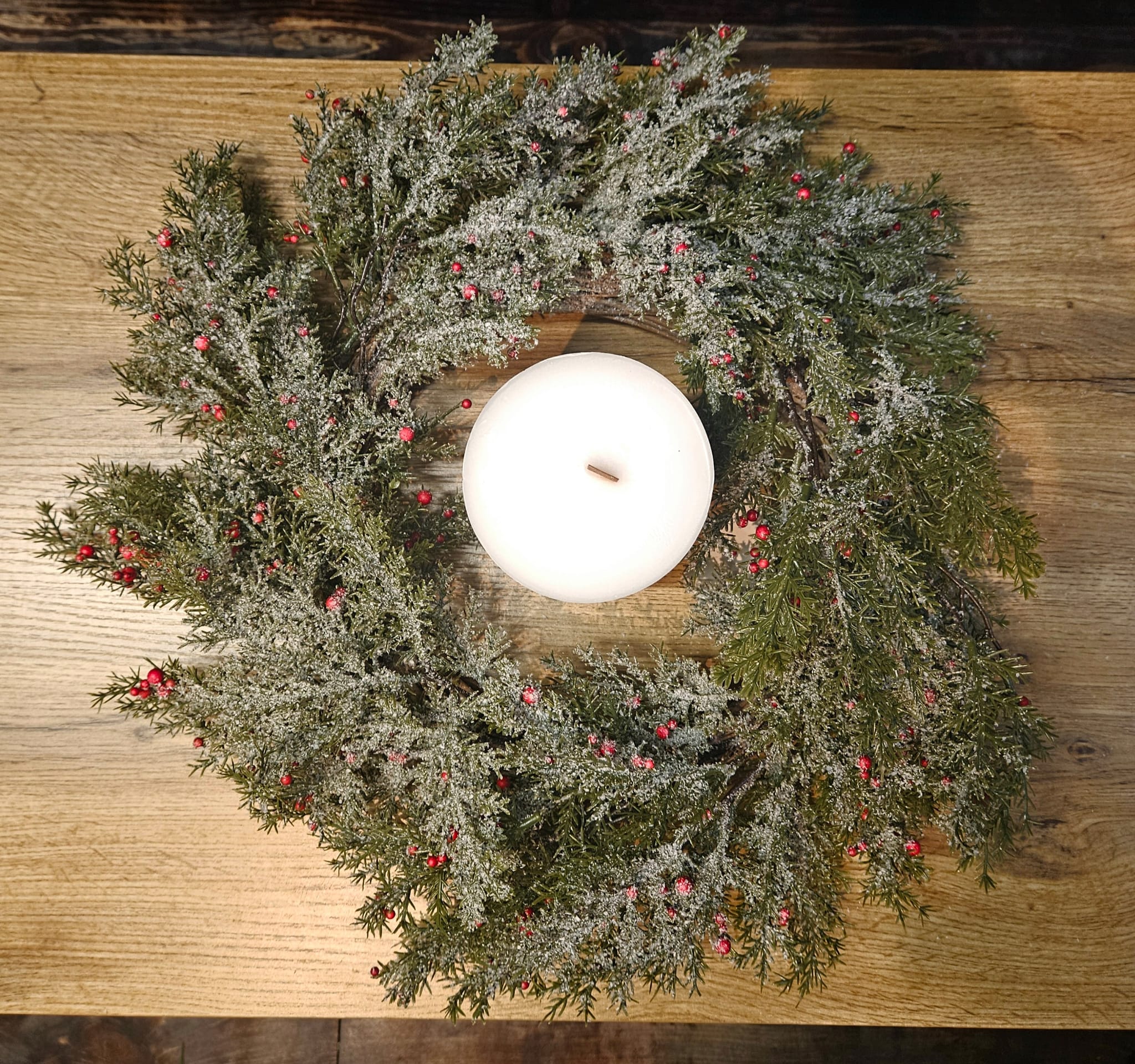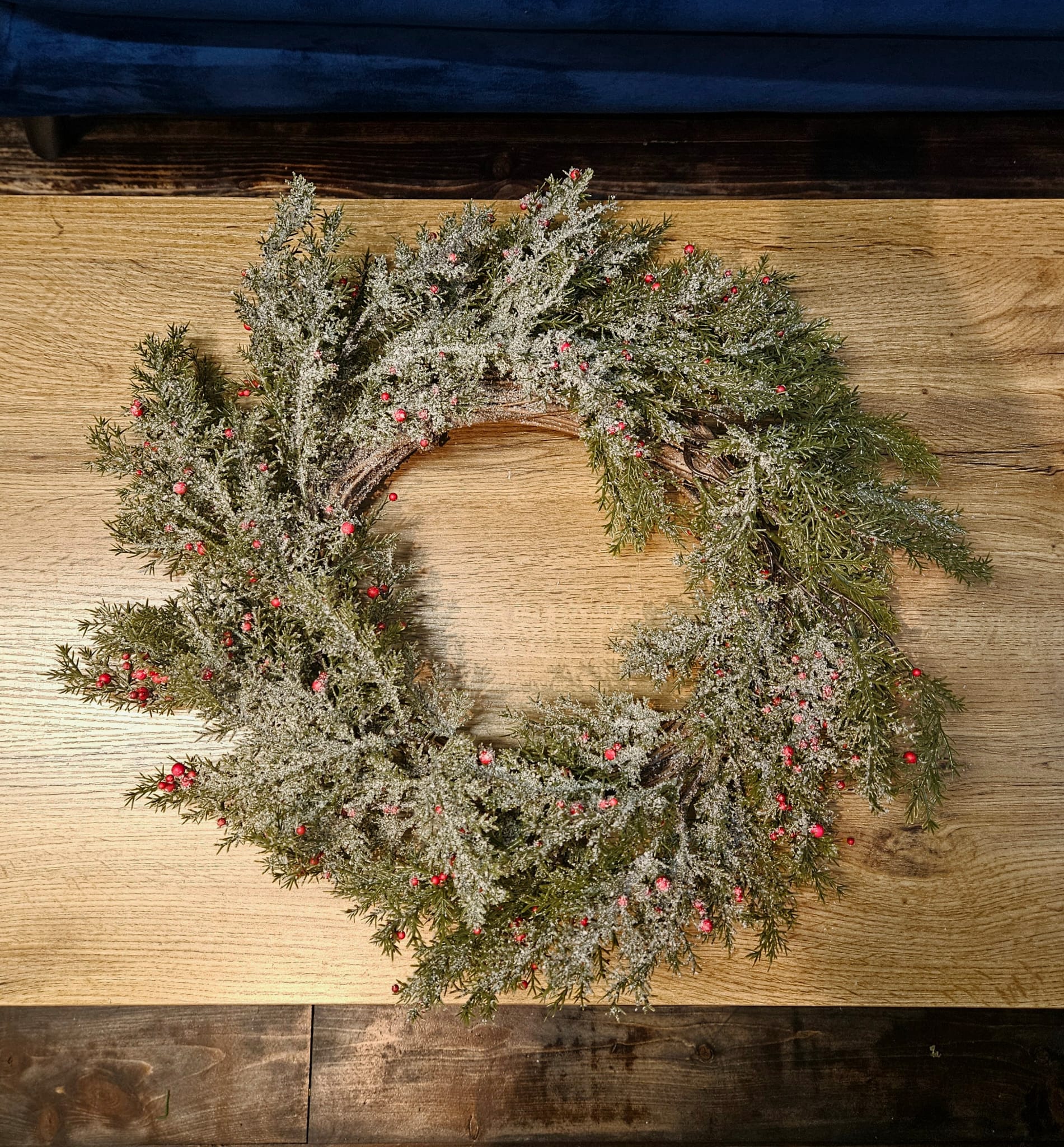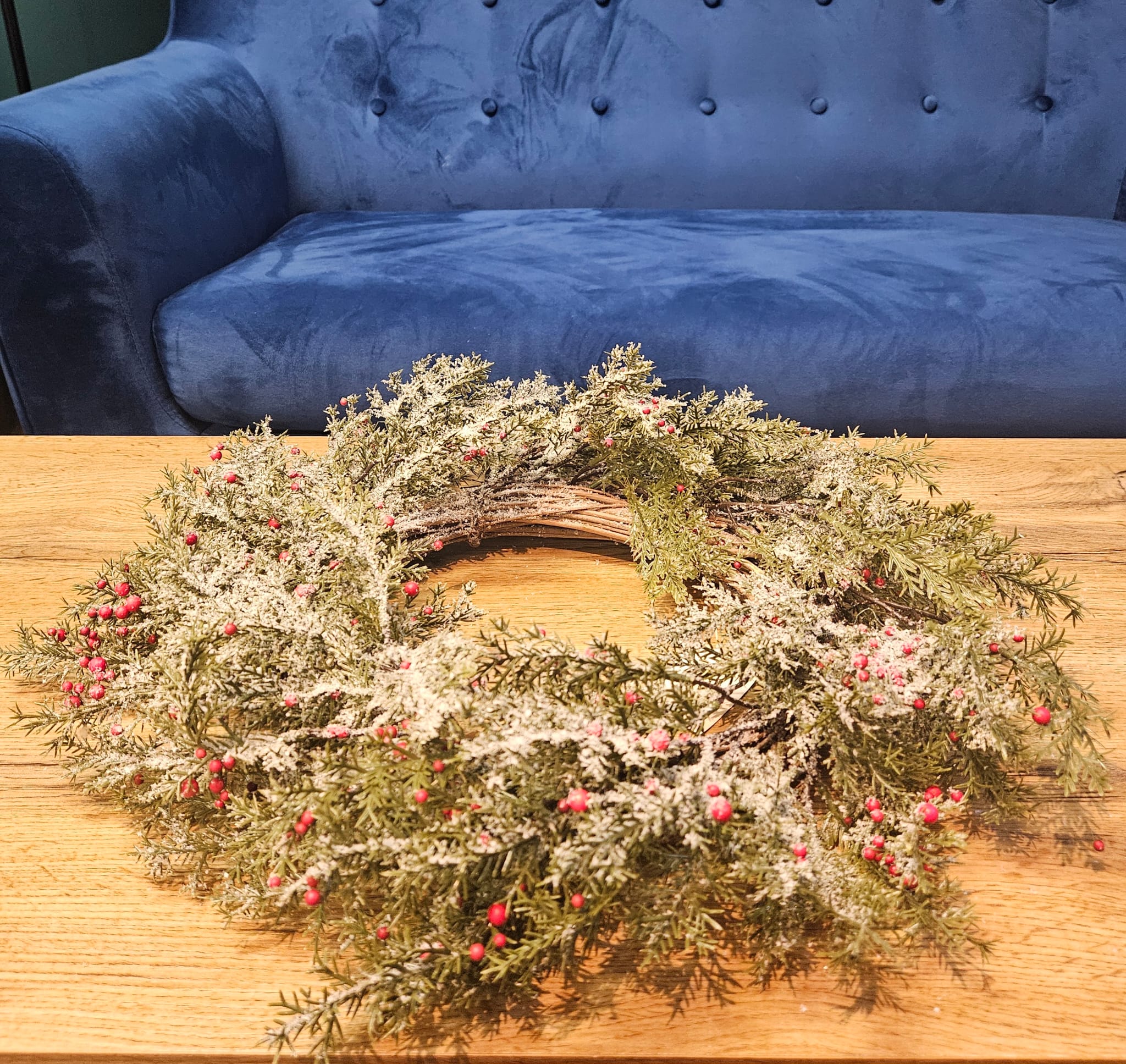 Věnec je doplněn drobnými dekorativními bobulemi v červených tónech, které mu dodávají slavnostní vzhled.