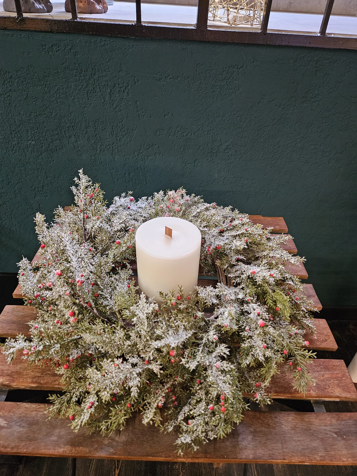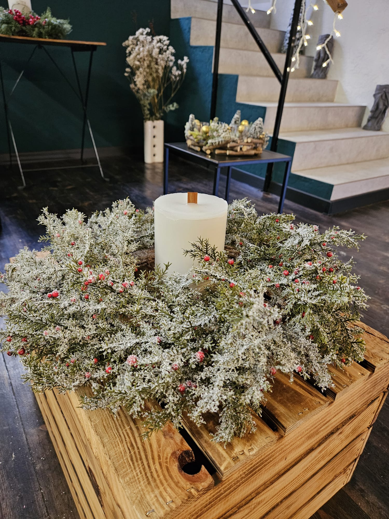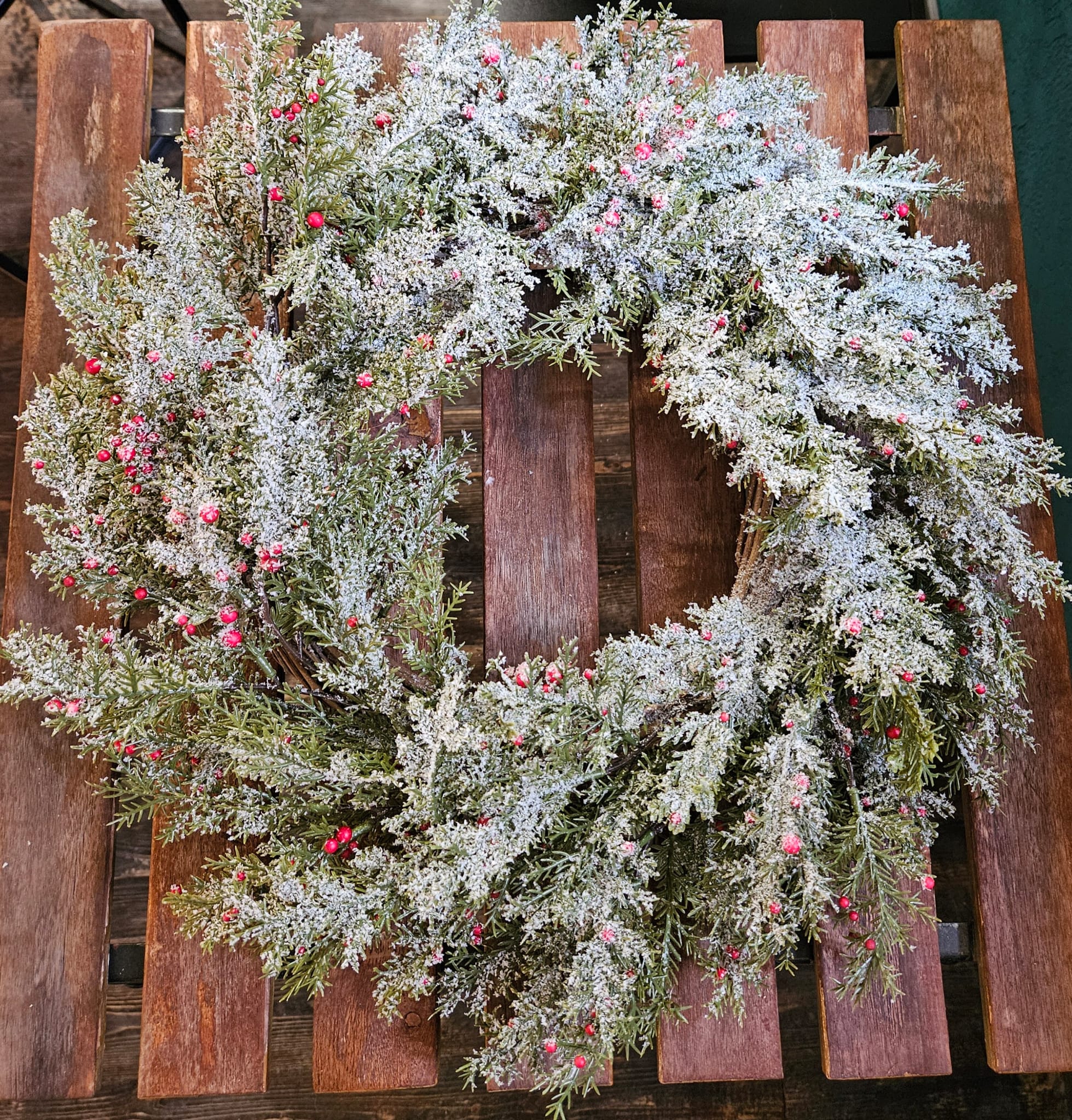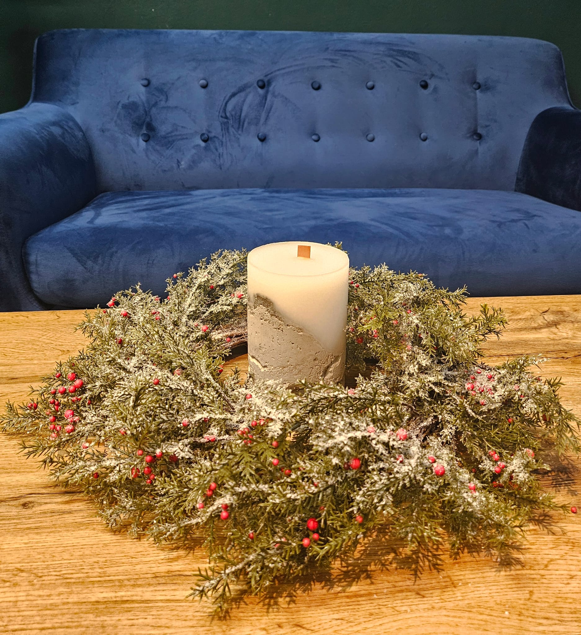 Věnec je doplněn drobnými dekorativními bobulemi v červených tónech, které mu dodávají slavnostní vzhled.